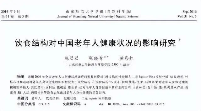 [1]陈双双.饮食结构对中国老年人健康状况的影响研究, 山东师范大学学报(自然科学版), 2016-09-15.